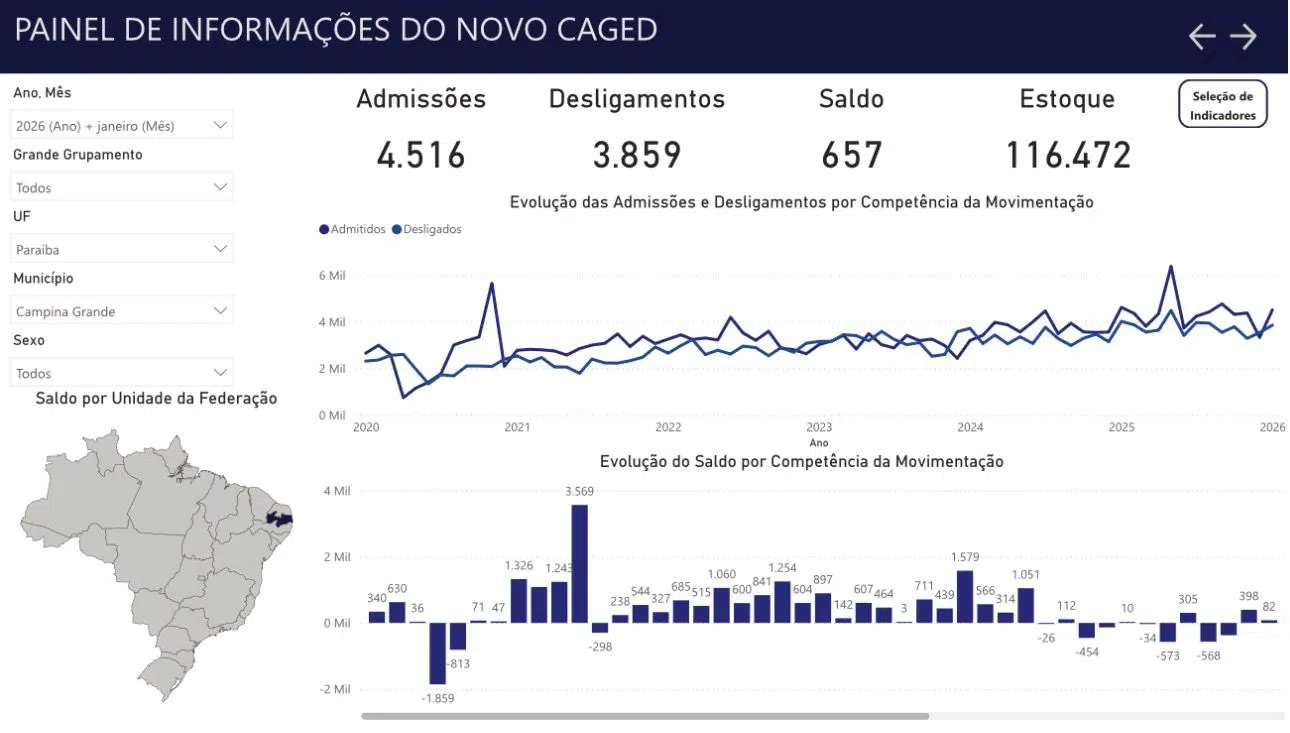 O Município de Campina Grande iniciou o ano de 2026 com saldo positivo na geração de empregos, conforme o Cadastro Geral de Empregados e Desempregados (Novo Caged).