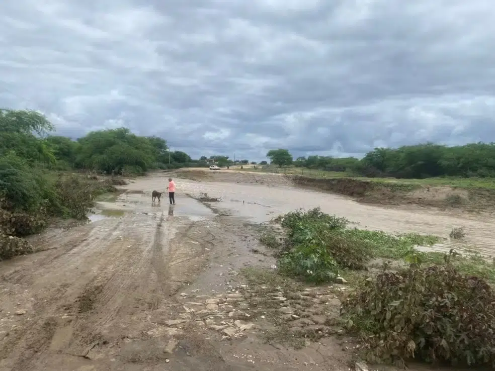 Moradores de Gurjão, no Cariri paraibano, ficaram ilhados após a cheia de um rio que interditou o trecho da rodovia que liga o município a Soledade.