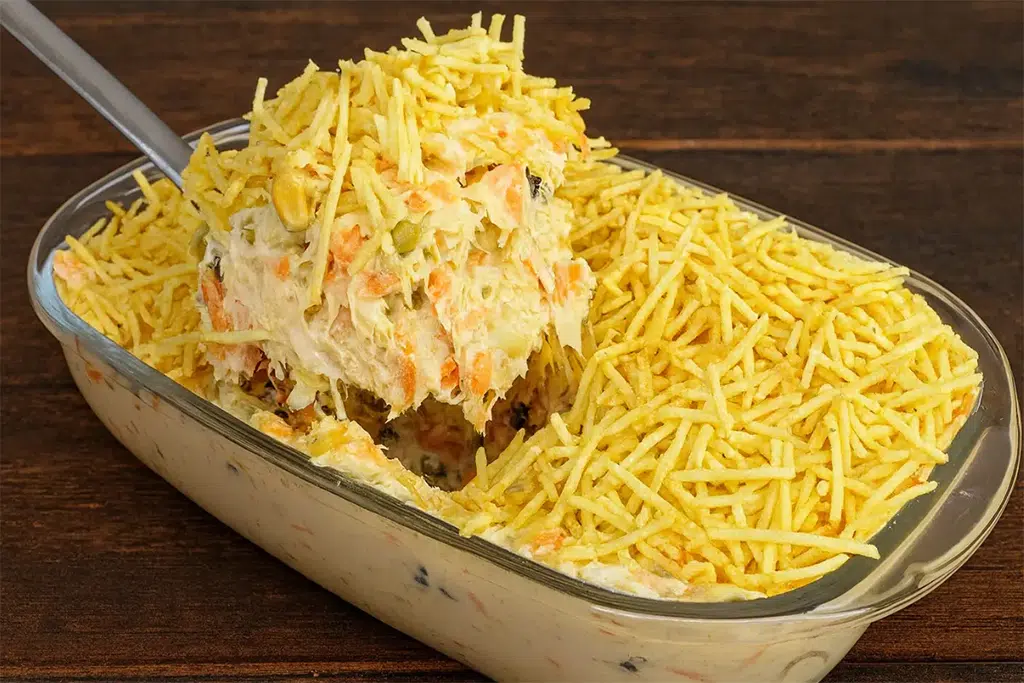 A receita leva frango desfiado, cenoura cozida no vapor, maçã com limão para não escurecer, milho, azeitona, uva-passa opcional e batata palha colocada apenas na finalização para garantir crocância.